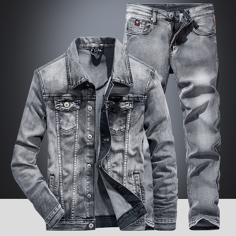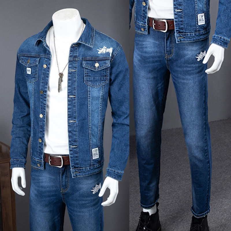 Fashion Hot Selling Men's Denim Suit Custom Fitness Two Piece Set Men's Bicycle Denim Jacket And Jeans Fabric Casual Knitted