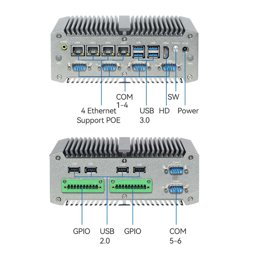 Interface | USB3.0*4、USB2.0*4, H-D-M-I*1、DC*1、COM *6 (COM1-2 support RS232/ RS485/ RS422), 1*GPIO |