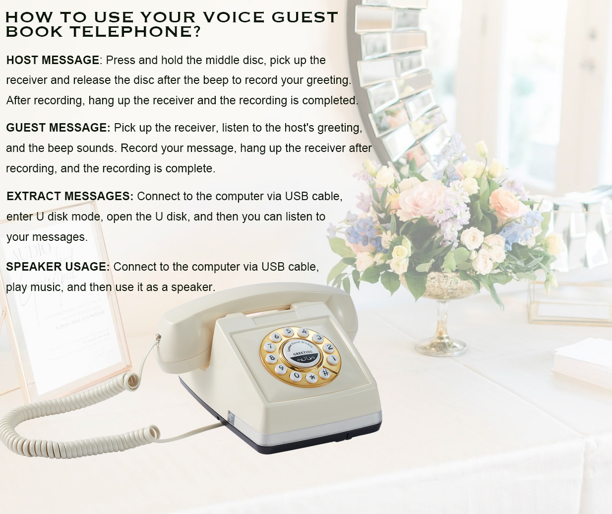 • [Guest Book Telephone]This audio guestbook goes beyond the written word, so that messages from family, friends or guests are no longer confined to paper. Guests can leave personalized messages for any occasion, which are saved for later playback. The phone itself is easy to use, with a classic design and functionality that brings a touch of nostalgia to any gathering.