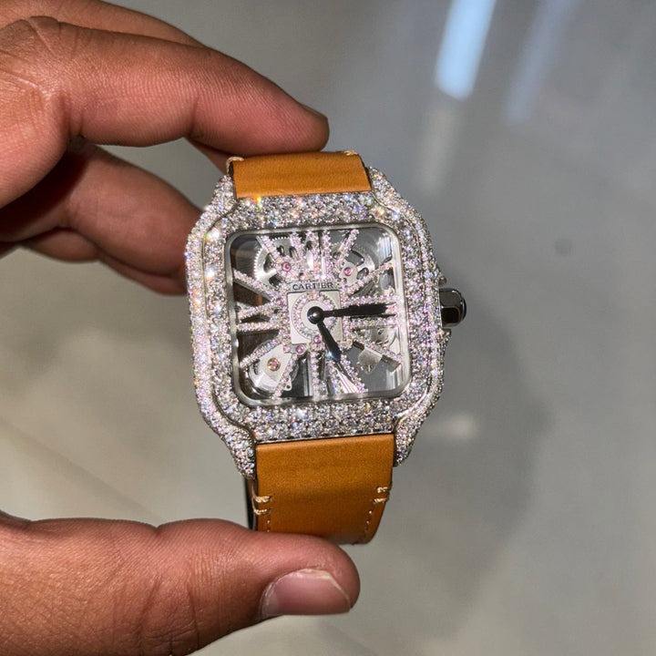 Iced Out Moissanite Diamond Watch Brown Leather Strap Stainless Steel Diamond Watch For him Men's Jewelry Gift For Him