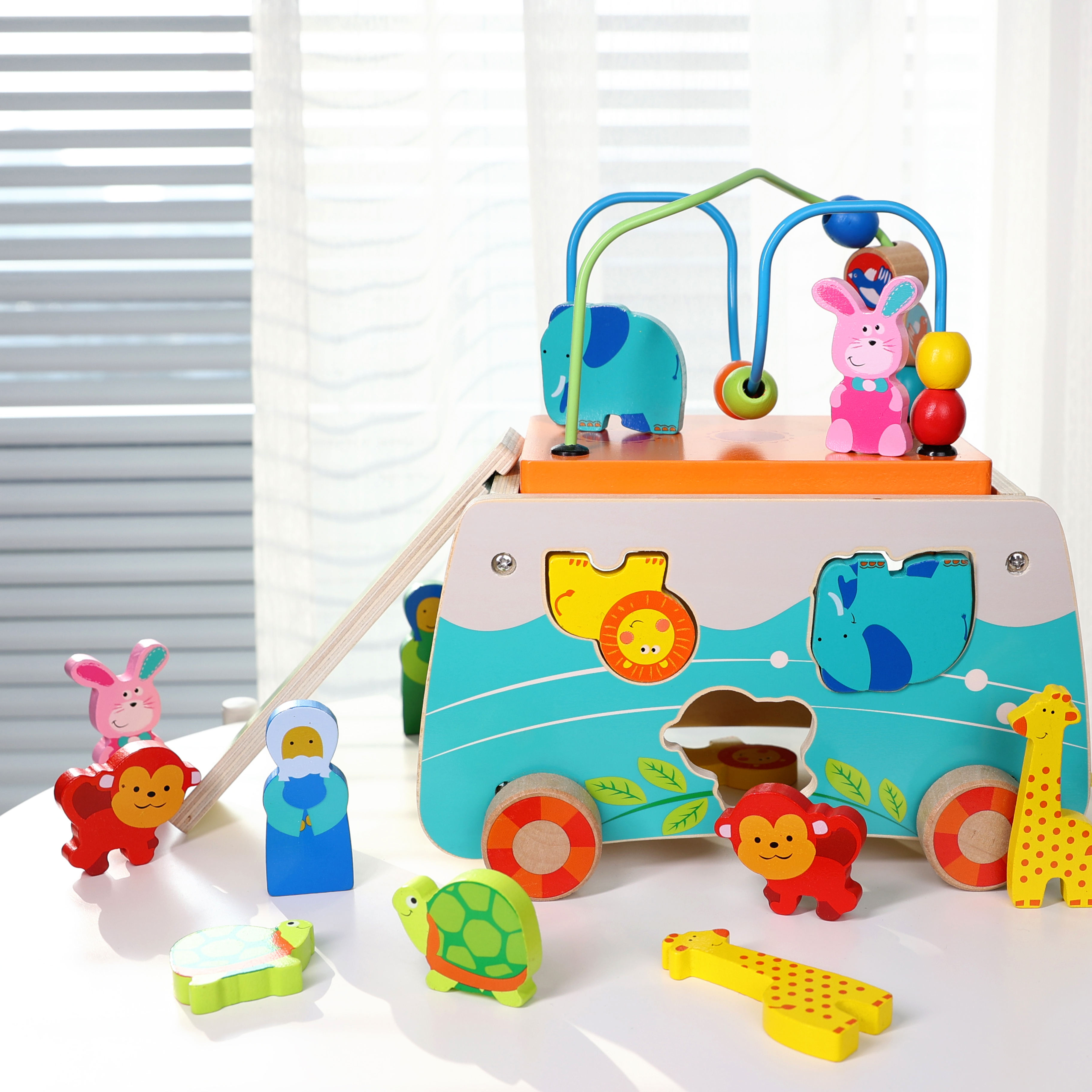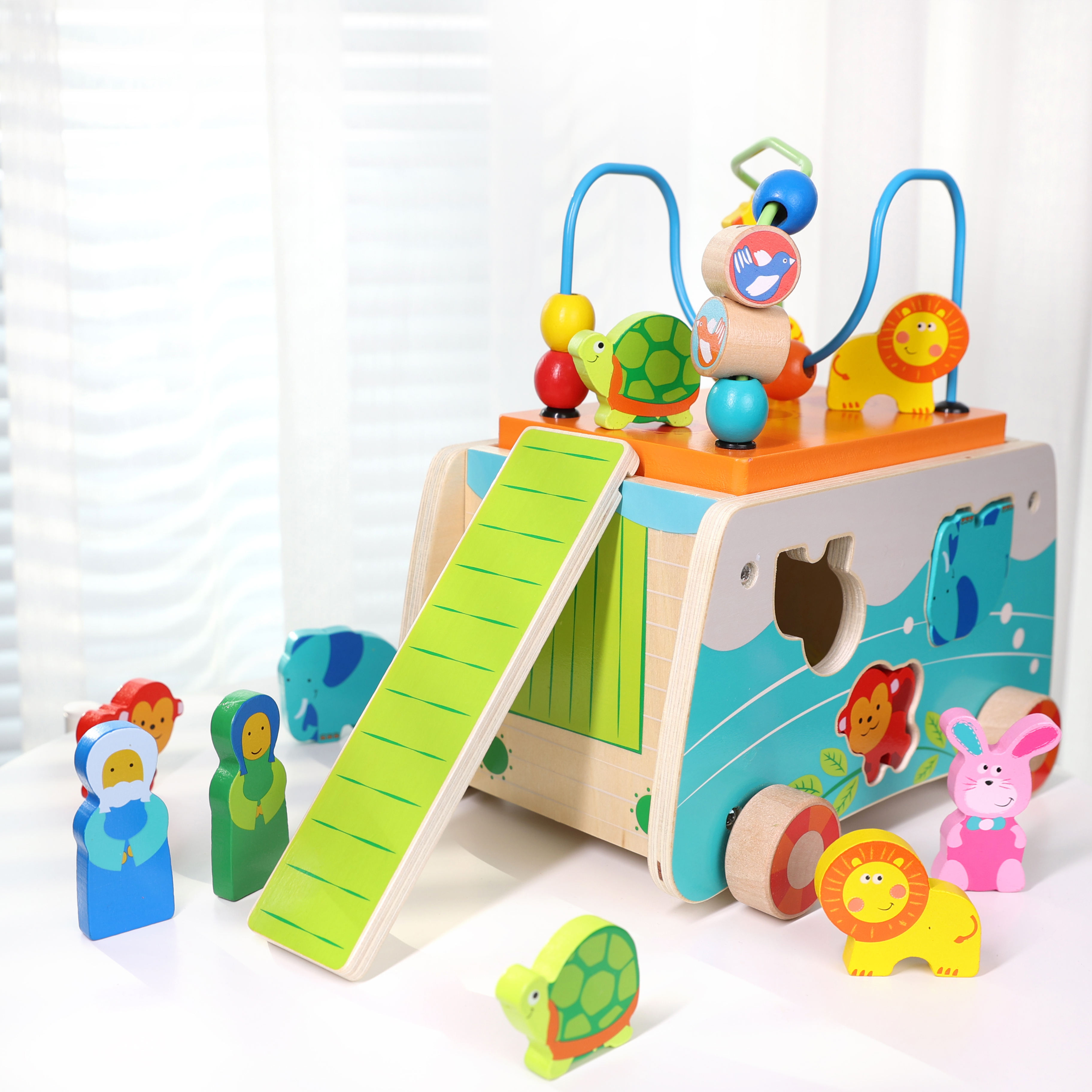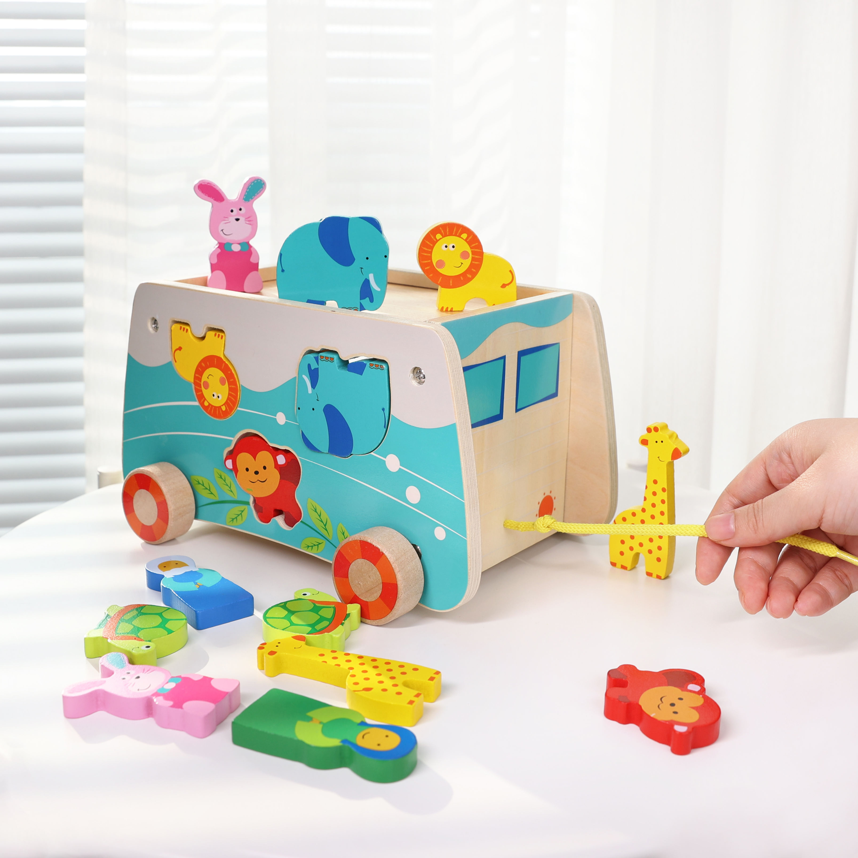 Children Early Educational Bamboo Pull Along Noah's Ark Wooden Animal Car Toys