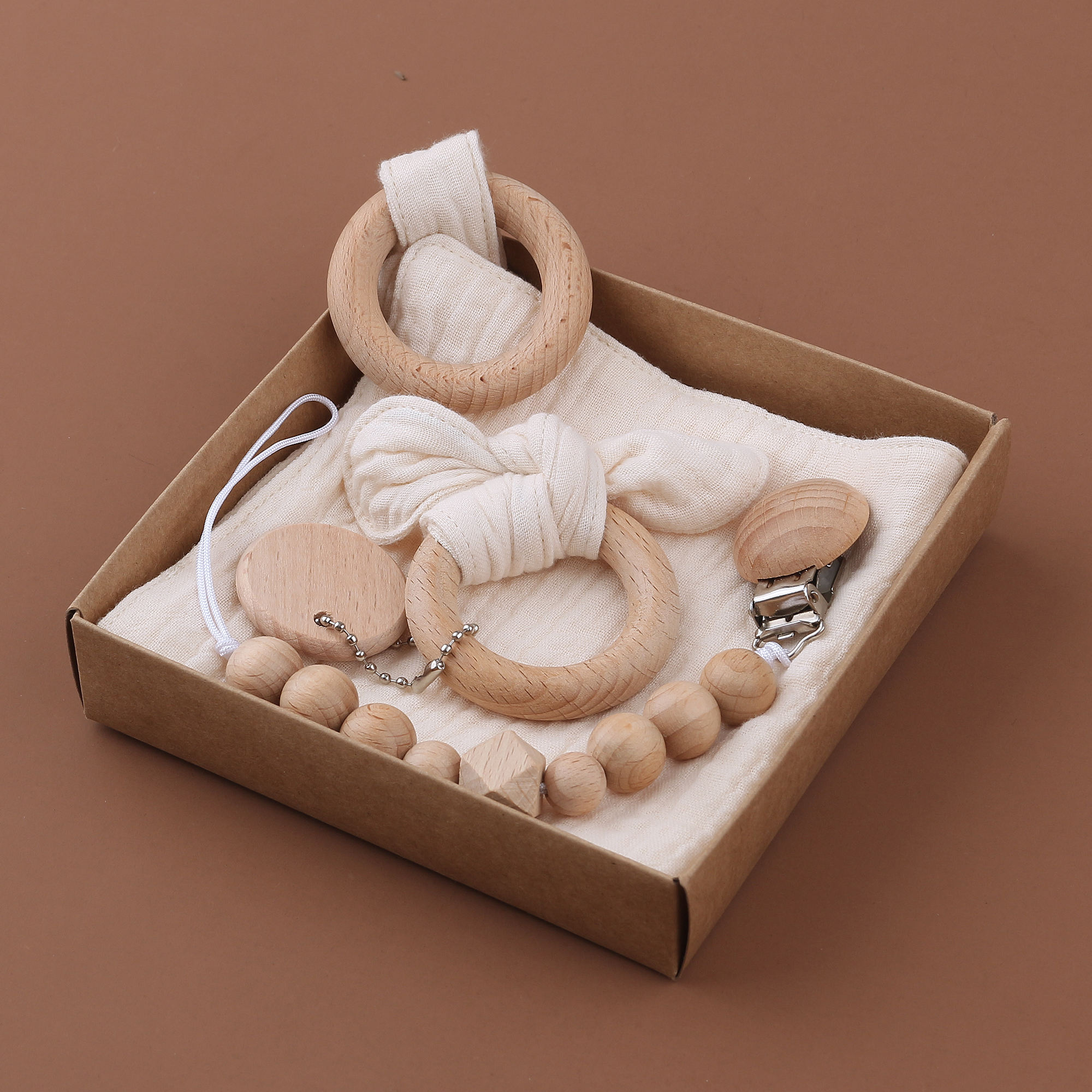 Promotional Baby Teething Wood Pacifier Clip Chain Cotton Cloth Baby Wooden Teething Toys Three Piece Suit